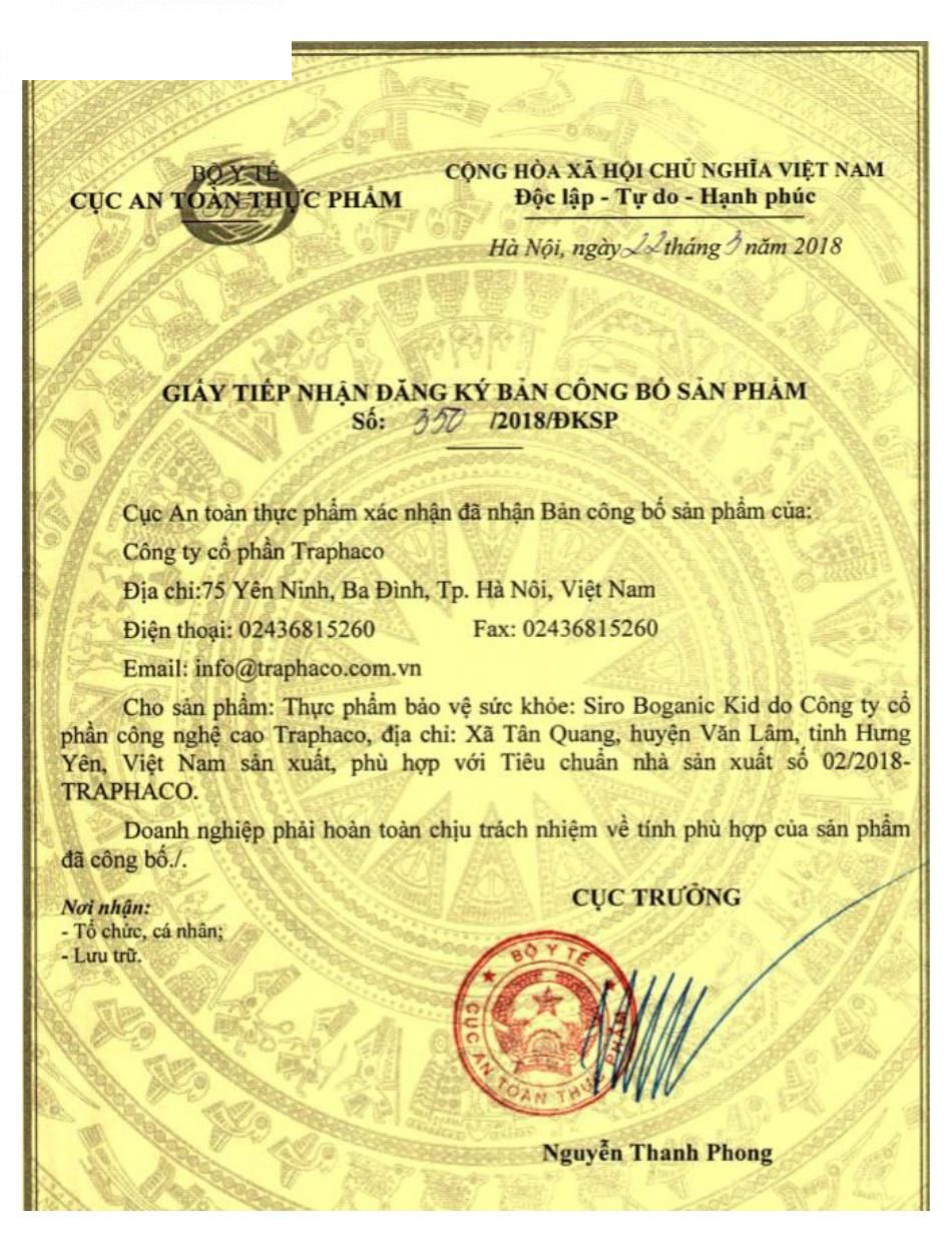 Boganic Kid được sản xuất bởi một đơn vị uy tín, tuân thủ nghiêm ngặt các quy định về sản xuất và kiểm định chất lượng. Điều này mang đến cho người tiêu dùng sự yên tâm tuyệt đối về nguồn gốc và chất lượng sản phẩm.