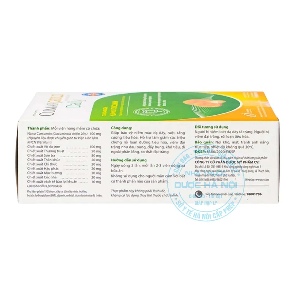 - Nano Curcumin (100mg): Giúp bảo vệ lớp niêm mạc dạ dày, chống viêm, làm lành vết loét, nâng cao khả năng hấp thu các dưỡng chất.