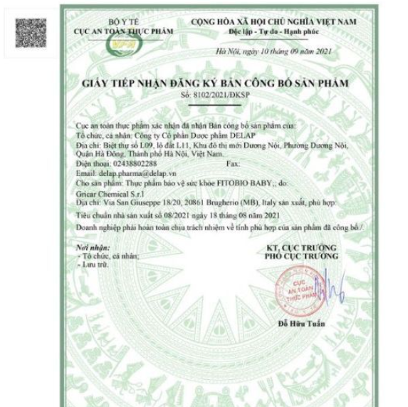 - Sản xuất theo tiêu chuẩn quốc tế: Fitobio Baby được sản xuất trên dây chuyền hiện đại, đạt chuẩn GMP, ISO 9001, tuân thủ các quy định nghiêm ngặt về chất lượng sản phẩm và an toàn vệ sinh thực phẩm. Điều này khẳng định chất lượng và độ tin cậy của sản phẩm.