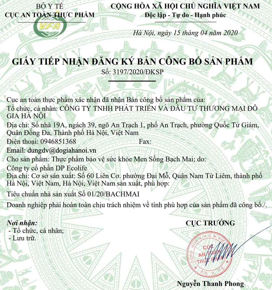 - Đảm bảo chất lượng: Men sống Bạch Mai được sản xuất theo dây chuyền công nghệ hiện đại, đạt tiêu chuẩn vệ sinh an toàn thực phẩm, được Bộ Y tế kiểm định chất lượng.