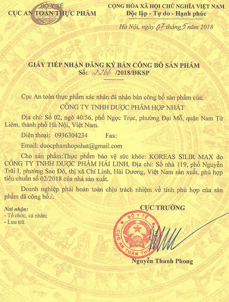 - Đã được Bộ Y tế cấp phép: Koreas Silir Max đã được Bộ Y tế cấp phép lưu hành toàn quốc theo số 2266/2018/ĐKSP, khẳng định chất lượng và độ an toàn của sản phẩm. Điều này giúp người dùng có thể tin tưởng vào hiệu quả và mức độ an toàn của sản phẩm.